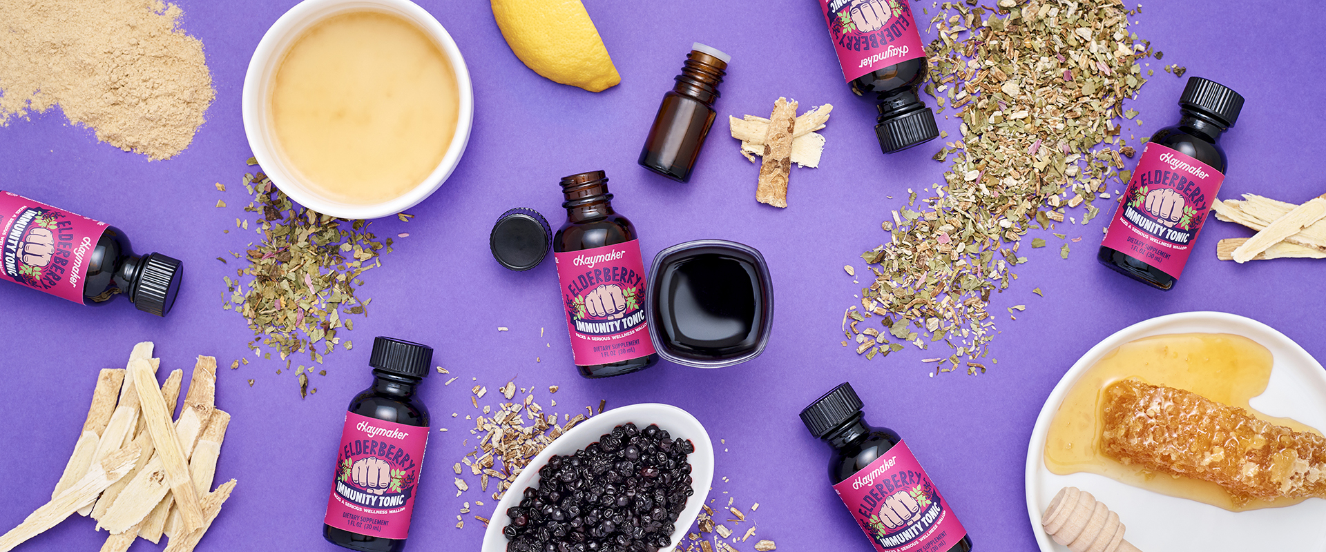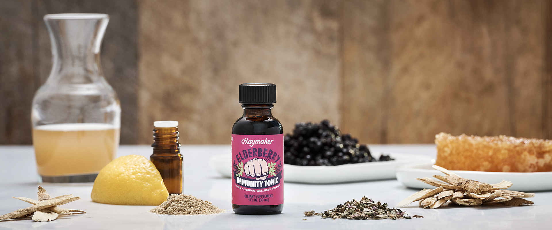 Like a wild, wailing haymaker, our Elderberry Immunity Tonic packs a serious wellness wallop! With the power of potent elderberries, raw honey, apple cider vinegar, echinacea, astragalus, turkey tail mushroom, and lemon oil, every taste is an herbal sucker punch to the senses and a boost to the immune system. Sipping Haymaker Tonics throughout the day is a surefire, natural way to keep the doctor away.