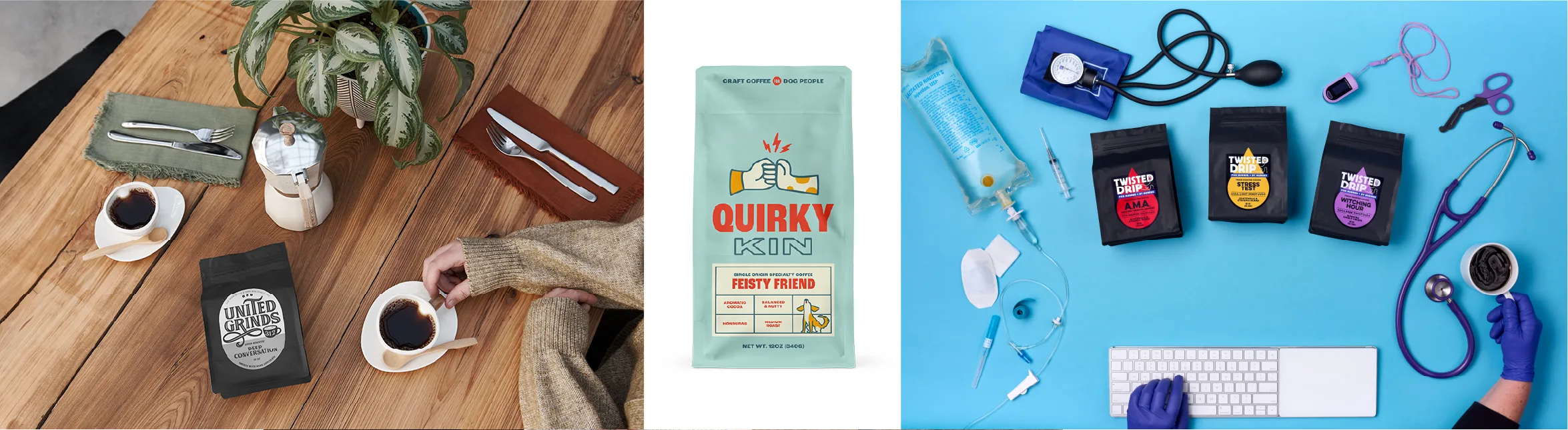 This is especially the case for drop shipping brands. While drop shipping is a great, lower risk way to get to market, there are only a handful of quality drop shippers in the US, with literally hundreds, if not thousands, of companies all selling the same exact coffee. Differentiating based on the product just isn’t a viable way to give customers a unique experience. The only realistic path to success is to find a distinct theme and concept, and to create a strategic brand that uses storytelling to resonate with a very specific customer. Good brands in this space don’t even really sell coffee – they sell a lifestyle, support for a meaningful mission, or some sort of shared passion. Owning a distinct, differentiating position in the market means building a tribe and a community, and that’s done through cohesive, consistent branding that connects.This is why you’ll see such diversity of style, personality, and theme in the brands we develop.