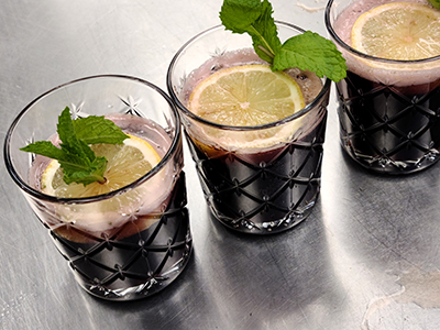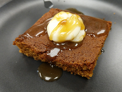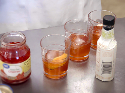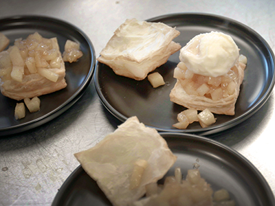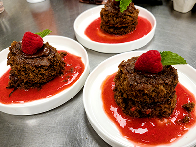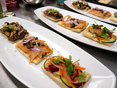 Apple Manhattan Apple Puff Pastry Axel Black Garlic Ribeye with Kelp Pickle Chimichurri and Twice Baked Alfredo Potato Bourbon Butterscotch Gingerbread Cookie Chimichurri Flank Steak with Creamy Polenta Cookie Fried Ice Cream Crispy Hearts of Palm Tacos with Mexican Street Popcorn Ezie Bee Old Fashioned Haymaker Wellness PunchOur Haymaker Wellness Punch packs a wallop! Full of complex flavor, the apple cider vinegar from the Haymaker Immunity Tonic cuts through, but the other ingredients balance the drink for a refreshing, totally unique cocktail that's sure not to disappoint! Mixed Berry Paloma Sauer Frau Chocolate Cake with Chocolate Caramel Sauce and Raspberry CoulisOur Sauer Frau Chocolate cake is made with Bavarian Sauerkraut, which makes this the most moist cake imaginable (sounds wild, but it's SO good!). It was accompanied by a chocolate caramel sauce, with orange oil and finely ground Brainwashed coffee, a raspberry coulis, and topped with a fresh raspberry and a single mint leaf. Trio of Mini-FlatbreadsOur trio of mini-flatbreads allowed us to feature 8 different Upstart Food Brands products in unique and exciting ways. They included: (1) Sugo with Smoked Salmon and Capers, (2) Cuban Style Black Bean Hummus with Mojo Chicken, and (3) Banh Mi with Quick Pickled Veggies and Spicy Mayo.