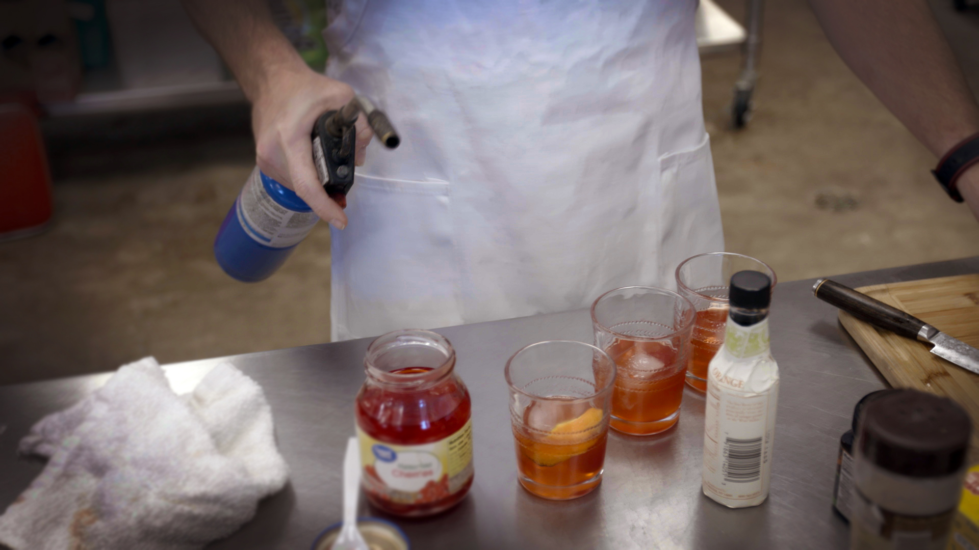 Muddle honey and cherry juice. Add whiskey and bitter.